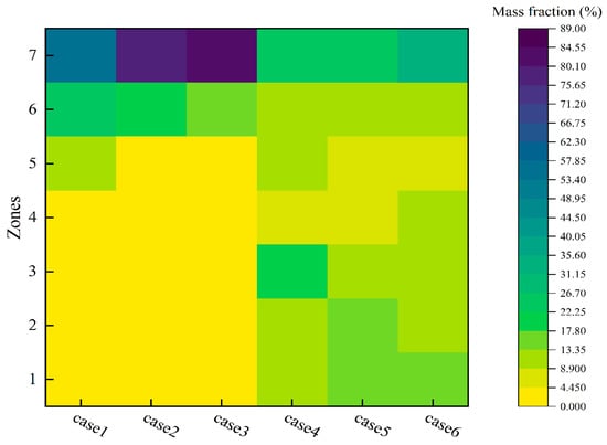 Figure 12 shows the proportion of droplet nuclei across different vertical heights. The subway carriage, with a height of Z = 2.1 m, was divided into seven regions, each with a vertical height of 30 cm. It can be observed that under the SFRC air supply system, at a height of 0–1.5 m (where Z = 1.5 m represents the breathing zone for standing passengers), the droplet distribution is uniform and the quantity is very small, with a proportion below 4.45%. At lower wind speeds, the proportion of droplet nuclei reached about 20%, with most droplet nuclei concentrated near the ceiling, above head level. The higher the air supply speed, the more nuclei accumulate near the ceiling.