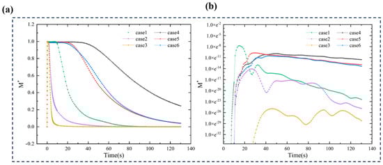 For the MV air supply system, the droplet nuclei were evenly distributed throughout the entire vertical area. This also indicates that the evenly distributed droplet nuclei near the return air outlets at the head and tail of the car are harder to remove. However, the return air outlets in the SFRC system, where droplet nuclei concentrate near the ceiling, are more effective at removing pollutants. This figure mainly illustrates the concentration levels of pollutants in the vertical direction for the two air supply systems. The absolute concentration of pollutants can be inferred from the concentration of tracer gas in Figure 13a. The y-axis represents the normalized average concentration. In the figure, it is clear that the pollutant concentration in the SFRC air supply system is significantly lower than in the MV system. The tracer gas concentration in the low-speed Case 1 is lower than in the high-speed Case 4. It can also be observed that the pollutant concentration in each case increases gradually. Throughout the process, the higher the air supply speed, the lower the pollutant concentration, and the fewer suspended droplet nuclei. Higher air supply speeds lead to greater efficiency in pollutant removal. At t = 65 s, the concentration in the SFRC system stabilizes and approaches zero. In contrast, under the MV system, pollutants still remain in the subway car at t = 120 s, with Case 4 at a low air speed of V = 0.8 m/s being the worst-performing scenario. Increasing ventilation rates helps remove droplet nuclei from the subway car through the exhaust, reducing both deposition and suspension of the droplets.