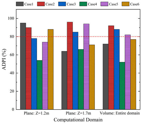ADPI is defined as the percentage of measurement points within the target area (e.g., the occupant activity zone) that meet the effective air supply temperature and velocity requirements, as shown in Equation (16): [42]