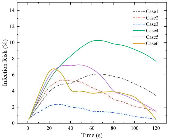 It can be observed from Figure 15 that, for all conditions, the infection risk probability initially increases and then decreases. In the MV system, the infection probability is highest at low air velocity, reaching a peak of 10.4% at t = 60 s when the droplets spread. Afterward, the virus particles gradually move toward the return air outlet and are expelled from the carriage, causing the infection probability to decrease gradually, with a relatively smooth fluctuation. At medium and high air velocities, the fluctuations are more intense. From Figure 6, it is evident that droplets spread more intensively between t = 20 s and t = 40 s, remaining in the space for a longer duration. As they do not flow to the return air outlet in time, a sharp increase in infection probability occurs. Subsequently, due to the effect of wind speed, the droplets flow to the return air outlet and are expelled. From this, it is clear that wind speed is a critical factor in droplet spread and infection risk, especially in confined spaces. For the SFRC air supply system, although droplet release due to coughing inevitably increases infection risk, the rise in risk probability is slower and the risk value is much lower compared to the MV system. At the same air velocity, the infection risk decreases by 6.4%, with the maximum difference reaching 8%. Compared to the same air velocity, the SFRC system exhibits a more stable infection probability, which decreases to below 5% in a shorter time. In the optimal condition (Case 3), the infection probability drops to below 2% after t = 45 s. From the perspectives of pollutant removal efficiency, infection risk, and comfort, this condition is the optimal one, providing a more comfortable and safer carriage environment.