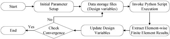Upon receiving MATLAB system commands, the Python script executes key operations as depicted in Figure 4. It first reads the *.cae file and design variables from the MATLAB-generated *.xlsx file. The script traverses design domain elements to update material properties, generating a new *.cae file for ABAQUS solver execution. Subsequently, element IDs and their corresponding result data from the *.odb file are extracted and written into a new *.xlsx file. During the first iteration, the script additionally outputs the centroid coordinates of all elements. Reading *.xlsx files via the ABAQUS Scripting Interface requires the openpyxl library. The ABAQUS scripts in this study are written in Python 3.10, which does not include the openpyxl module by default, necessitating its separate download and installation for program execution.