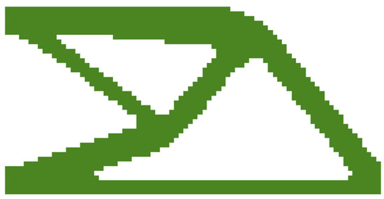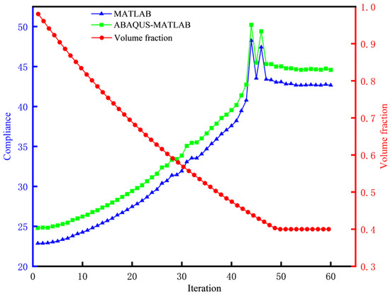 The optimized structure exhibits a typical truss-type load transfer path. Compared to the result from the original MATLAB-based program (without ABAQUS integration) [12] in Figure 7, the discrepancies in computational results between the MATLAB framework and the proposed ABAQUS–MATLAB framework stem from differences in element type precision. Consequently, the compliance values obtained by the proposed method are marginally higher than those derived from the MATLAB framework alone. However, the topological configurations of both methods are essentially consistent, with similar evolutionary histories. The final compliance error between the two results is 4%, while the proposed method achieves an iteration time of 18.7 s per cycle and a total optimization duration of 1124 s. The compliance and volume fraction evolution histories of both methods are compared in Figure 8, confirming the validity of the cooperative optimization framework.