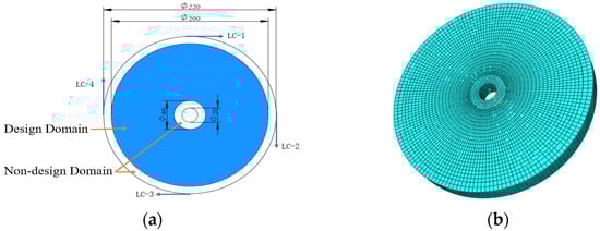 To further validate the efficiency improvement of the proposed cooperative optimization method for the BESO algorithm, a comparative study is conducted between the proposed framework and the BESO method implemented solely via ABAQUS scripting [21]. A wheel hub model is selected for optimization. The hub dimensions are shown in Figure 9a, with a thickness of 20 mm. The inner and outer annular regions (white) are designated as non-design domains, while the intermediate annular region (blue) serves as the design domain. Radial concentrated loads of 1 N are applied at four equally spaced points on the outer ring, and the inner ring is fully fixed. The meshed model is illustrated in Figure 9b.