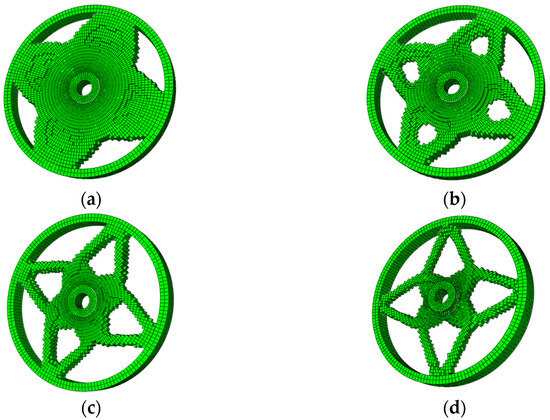 Iterative optimization process of the 3D wheel hub using the cooperative framework. (a) Iteration 7; (b) Iteration 17; (c) Iteration 27; (d) Iteration 60.