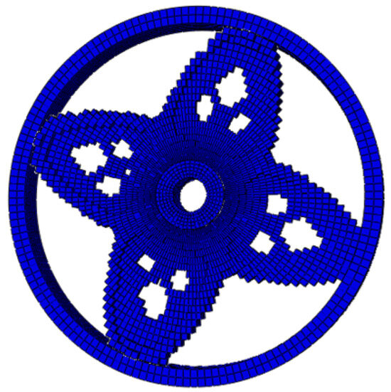 The CAE model parameters and MATLAB program settings for the ABAQUS–MATLAB cooperative framework are detailed in Table 3. After submitting the topology optimization task, the iterative process is shown in Figure 10a–d, with the final configuration after 60 iterations (Figure 10d) exhibiting radially distributed stiffening ribs and symmetric void structures. The optimization result from the ABAQUS-only BESO implementation is presented in Figure 11. The compliance and volume fraction evolution histories of both methods are compared in Figure 12.