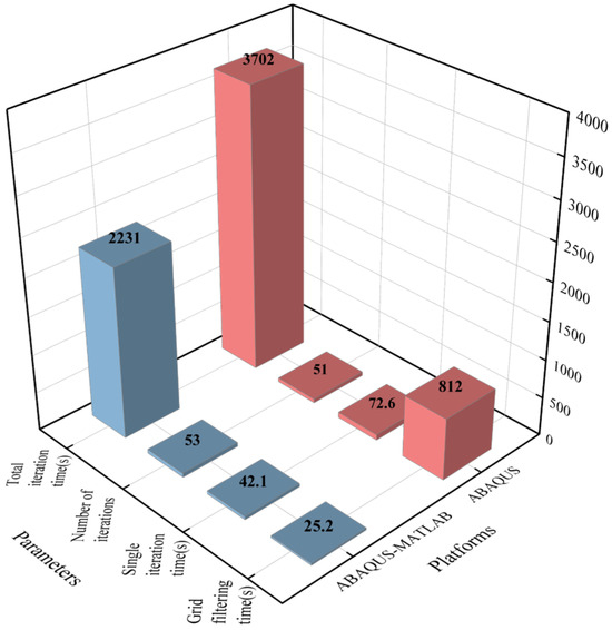 A comparison between the cooperative framework result (Figure 10d) and the ABAQUS-only result (Figure 11) reveals similar topological configurations. Table 4 quantifies the computational efficiency of both platforms, with a more intuitive comparison provided in Figure 13. The ABAQUS-only platform requires 1.65 times more total computation time than the cooperative framework, with grid filtering preparation consuming the majority of time (812 s). In contrast, the cooperative framework reduces grid filtering time to 25.2 s. This disparity arises because Python-based matrix operations in the ABAQUS-only platform iteratively traverse matrix elements, whereas the MATLAB-integrated framework leverages MATLAB’s optimized matrix computation capabilities. Although data exchange between ABAQUS and MATLAB incurs minor overhead, this time is negligible compared to the overall efficiency gains. Notably, the computational gap widens with increasing mesh density.