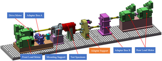 Hydraulic transmissions, as core powertrain components in construction machinery and heavy-duty vehicles, require performance validation and factory testing via test benches to ensure product quality. As shown in Figure 14, the test bench employs a drive motor to simulate engine input and a load motor to simulate operational loads. The mechanical system adopts a modular design, with adapter boxes and driveline configurations, enhancing adaptability to meet testing requirements for various hydraulic transmission models.