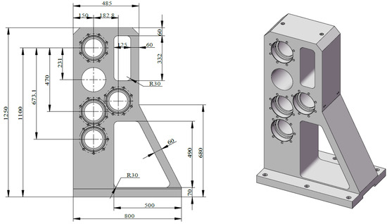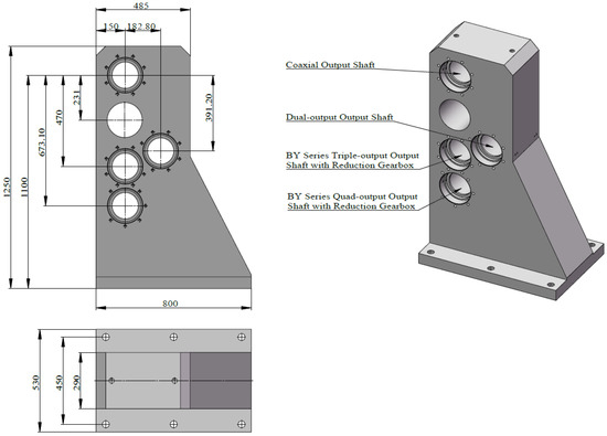 The adapter support, located between the test specimen and adapter box, is a critical load-bearing component subjected to complex alternating loads such as torque and vibrational impacts. The initial design, as shown in Figure 15, utilizes gray cast iron HT300, CNC-machined with a volume of 0.1866 m3 and a mass of 1362 kg, ensuring load transmission stability, vibration reduction, and structural rigidity.