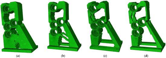 The CAE model parameters and MATLAB program settings for the proposed ABAQUS–MATLAB cooperative framework are summarized in Table 1. After submitting the topology optimization task, the iterative process is illustrated in Figure 6a–d. The final configuration after 60 iterations is shown in Figure 6d.
