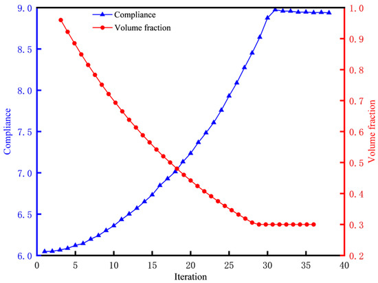 The iterative optimization process is illustrated in Figure 18a–d, with the final configuration after 38 iterations featuring curved stiffening ribs and honeycomb-like voids, as shown in Figure 18d. The compliance and volume fraction evolution histories are shown in Figure 19.