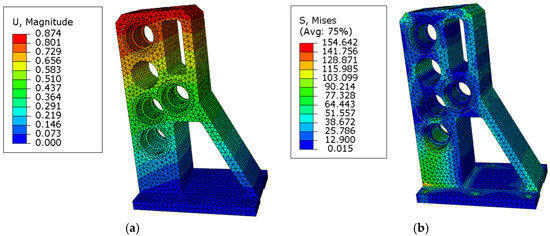FEA results of the optimized adapter support. (a) Displacement nephogram; (b) stress nephogram.