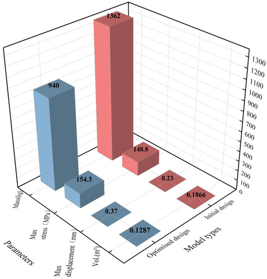 Based on the optimized topology, the redesigned structure (Figure 20) achieves a volume of 0.1287 m3 and a mass of 940 kg, representing a 31% reduction. Post-optimization FEA results (Figure 21a,b) show a maximum displacement of 0.874 mm and maximum stress of 154.6 MPa, compliant with ASME B30.7-2021 standards [41].