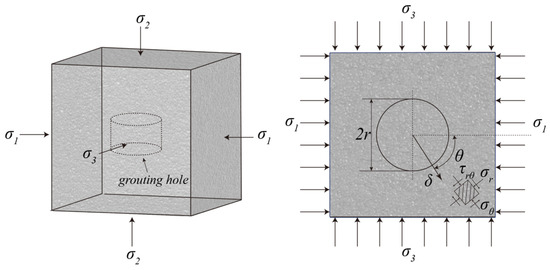 In this study, the rock mass is modeled as an elastic semi-infinite body. Assuming the rock mass to be a homogeneous and isotropic elastic medium, the stress state around the grouting hole can be simplified as a plane strain problem. Typically, grouting holes in these projects are circular; therefore, the established model of a flat circular hole is shown in Figure 1. The rock mass surrounding the grouting hole experiences two principal stresses that are unequal and perpendicular to each other in the horizontal direction. Here, δ1 represents the maximum principal stress, and δ3 denotes the minimum principal stress. The rock mass around the circular hole is subjected to radial stress (δr), circumferential stress (δθ), and shear stress (δrθ) at a distance (r) from the hole wall to the center of the grouting hole and at an angle (θ) with the X-axis.