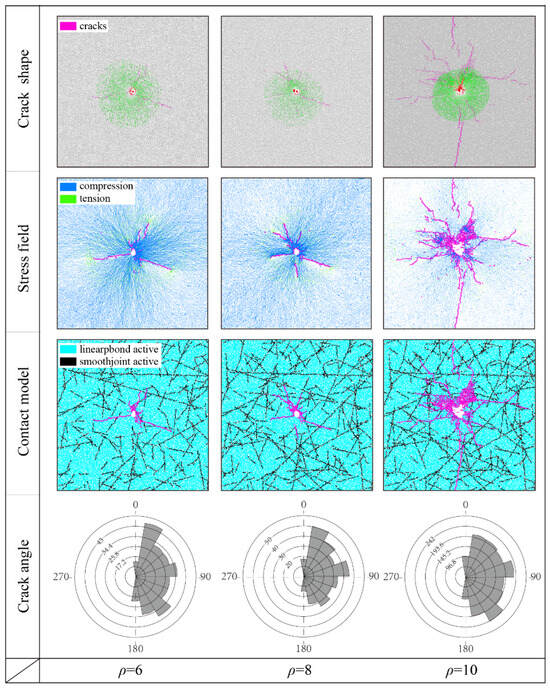 Natural fractures are widely distributed in strata and are typically characterized using statistical methods. Fracture density serves as one of the key indicators used to describe these fractures. In two-dimensional models, fracture density (represented by ρ) denotes the number of intersecting joints per unit length. This section examines the impact of fracture development on grouting effectiveness. The physical and mechanical properties of the rock mass and ground stress levels remain consistent with those previously discussed. Crack size follows a power law distribution, and crack positions follow a uniform distribution. ρ is categorized into 3 levels: 6, 8, and 10, respectively.