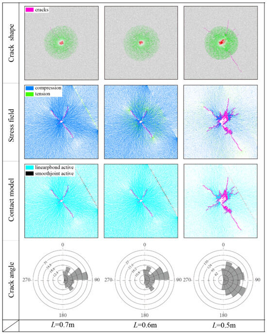 Grouting near geological structures results in distinct crack propagation patterns and varying microseismic events compared to more homogeneous areas. To address this issue, three experimental groups were devised to investigate how faults influence the grouting process at distances of 0.5, 0.6, and 0.7 m from the grouting holes, all under a consistent grouting pressure of 24.24 MPa. Figure 4 presents the numerical simulation results.