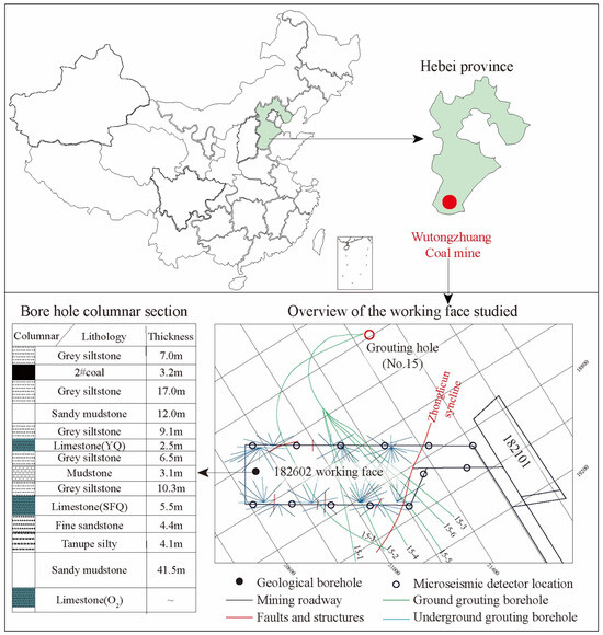 In terms of application in the field, Jiang et al. [18] obtained the measured parameters such as the activation pattern of the geological structure, the depth of the floor damage zone, the height of the fractured zone, and the size of the reasonable coal pillar through the three-dimensional display of the microseismic positioning results. Sun and Wang [19] established a prediction model of water-conducting channel based on microseismic monitoring signal mutation analysis by fitting the activation damage depth data from on-site microseismic monitoring. Jin et al. [20] developed a method of identifying water-conducting channels based on the inversion of microseismic energy density and rupture connectivity of the rock layer, and verified it in the field by visual resistivity monitoring data. Zhou et al. [21] utilized microseismic monitoring to classify the water-conducting channels into four types and find the weak areas of the grouting curtain, which compensates well for the weak links of water inrush. The above research results can be used to locate the position and types of water-conducting channels, classify the areas with high water-surge potential, and be applied in the prevention and control of water hazards on the floor and roof dynamic disasters in coal mines through microseismic monitoring. However, they all belong to the monitoring during the process of engineering disturbance and lack of timeliness, which means that violent water inrush accidents cannot be avoided if the water-conducting channel is connected to a water source with high water pressure and high water volume. There is a lack of research on the distribution patterns of microseismicity events induced by other man-made works (floor grouting, etc.) during the period when the working face has not yet been mined, and whether it can be used as an indicator for predicting water inrush. We refer to the microseismicity induced by grouting works prior to coal seam mining as “Pre-mining Grouting-induced Microseismicity, PMGIM”.