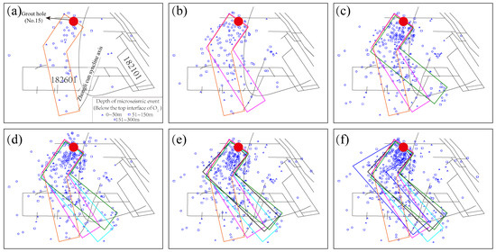 In Figure 6a, a total of 40 microseismic events were detected between January and February 2018, with 70% (28) concentrated within the grouting disturbance area. In subsequent periods (as depicted in Figure 6b–f), spanning January through September 2018, the number of detected microseismic events rose steadily to 337. During this time, the proportion concentrated within the grouting disturbance area fluctuated slightly but generally stabilized between 62.0% and 67.9% as follows: 66.2% from January to February, 66.8% in April, 67.9% in May, 67.6% in July, and 62.0% in September.