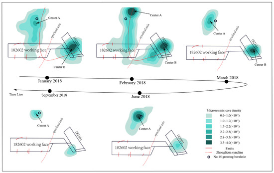 Figure 7 illustrates the kernel density cloud map of microseismic events at the 182602 working face. During period 1, the core density of PMGIM events was centered on the Zhonglicun syncline axis, forming a “V”-shaped, two-center continuous pattern. The high-frequency core density zcenters “A” and “B” were positioned near the main grouting hole and the central region of the 182101 working face, respectively. As a result of continuous grouting, the range of core density center “A” in February 2018 expanded significantly. In period 2, the planar distribution of core densities for microseismic events exhibited phased changes. In March 2018, the nuclear density values displayed a two-center discontinuous pattern extending from the northwest to the southeast. By June 2018, the nuclear density values revealed a central discontinuous pattern oriented from the northwest to the southeast. Compared to March 2018, the density value of core “A” rose by 19.2%, while the density value of core “B” declined by 41.3%. By September 2018, the nuclear density values exhibited a discontinuous layout from northwest to southeast, with the two centers disappearing. Compared to June 2018, the core density value of center “A” decreased by 45.1%, and that of center “B” decreased by 41%. During period 2, there was virtually no microseismic event response in the 182602 working face, indicating effective sealing of the fractures.