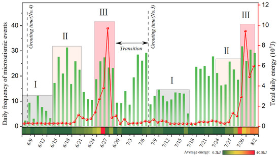 A total of 900 PMGIM events were recorded on the floor of the coal seam between 10 June and 20 August, prior to mining at the 182602 working face. Figure 8 illustrates how these events are categorized into four distinct stages based on their frequency and energy characteristics, as follows:
