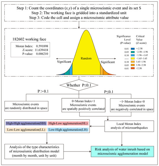 The analysis route for identifying the dangerous water inrush areas on the working face using Moran’s index in this study is illustrated in Figure 10.