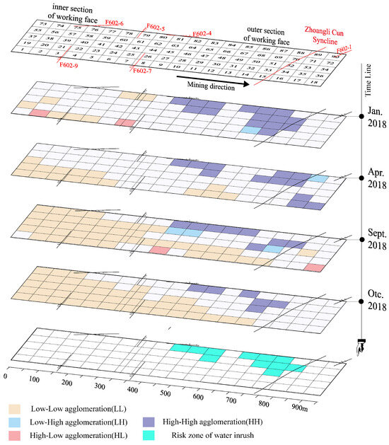 According to the PMGIM distribution results using the local Moran’s index, regions at high risk of water inrush were identified. One area includes units 81, 82, 83, 64, and 65 HH, located 400–550 m along the return air lane (near the F602-4 fault area). The other area includes units 85, 86, 87, 68, 69, 70, and 51, located near the Zhong Lishun syncline axis, as illustrated in Figure 11.