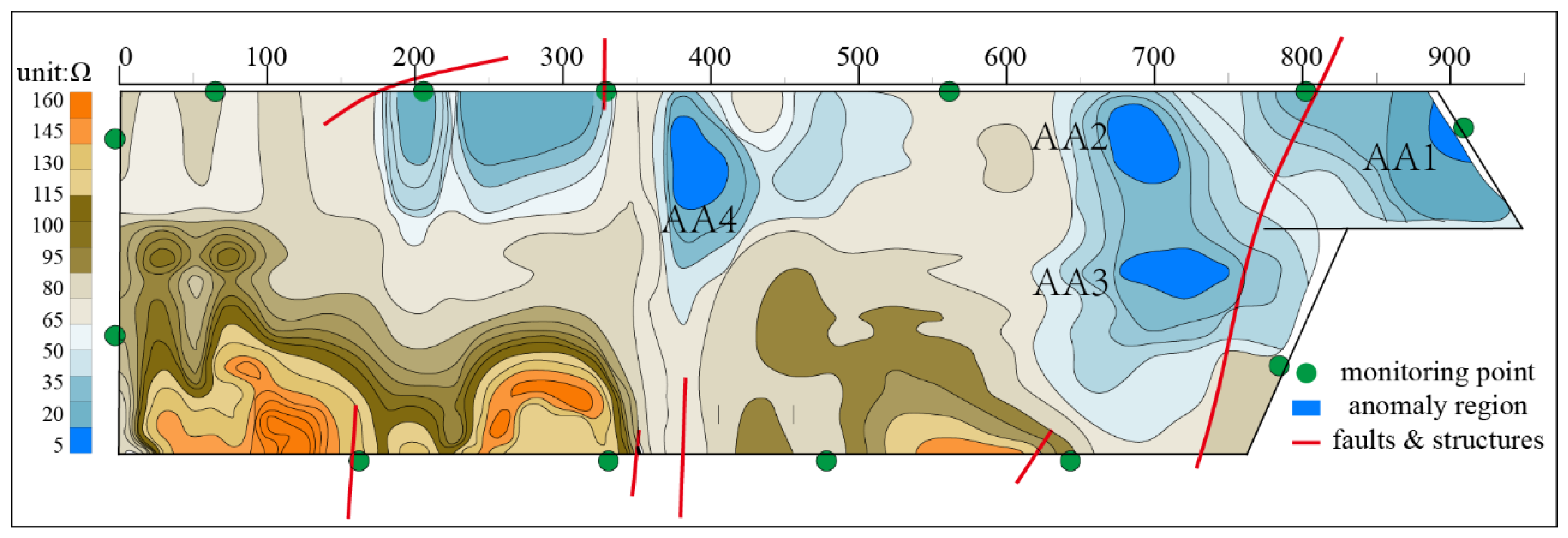 The network parallel electrical method is founded on analyzing and interpreting apparent resistivity data of rock mass, where areas of low resistivity typically denote water-rich anomalies or water-bearing structures. Figure 12 depicts the results of parallel electrical geophysical exploration on the 182602 working face. Along the strike, four anomalous areas (AA1, AA2, AA3, and AA4) were identified in the outer section of the working face, confirmed later by drilling to have significant water presence, closely matching the high-risk zones for severe water inrush identified by Moran’s index analysis. Abnormal microseismic events persisted in area AA4 during mining operations, escalating the risk of water inrush. Subsequently, a drainage borehole was constructed, discharging water at a maximum rate of 130 m3/h to prevent water inrush. This underscores the primary PMGIM event as pivotal in delineating areas prone to water inrush.
