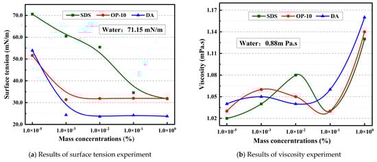 The surface tension and viscosity of these suppressants were measured using an automatic interfacial tension meter and a Shanghai viscosimeter, with the test conditions maintained at a temperature of 25 °C and a humidity of 43% RH. The results are shown in Figure 2.