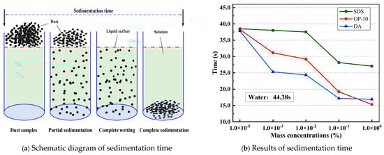 The sedimentation time experiment is a robust method for assessing the wettability of dust suppressants on dust. The wettability of dust suppressants is directly proportional to the sedimentation rate at which the solution wets dust [26,27]. A schematic design of the sedimentation time experiment is shown in Figure 3a. Specifically, the test solution (20.0 mL) was poured into a 25.0 mL test tube, dried test dust (1.0 g) was cautiously added into the test tube, and the duration it took for all the dust particles to settle to the bottom of the solution was measured, as shown in Figure 3b.