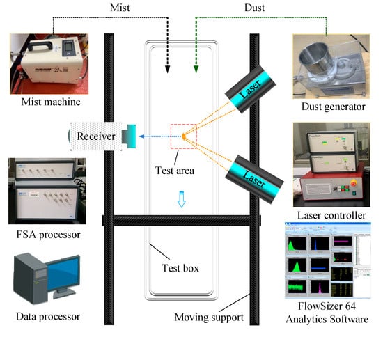 An experimental test system for analyzing dust–mist coupling behavior based on a PDPA tester is constructed, which can be used to study dust–mist coupling behavior under different spray pressures and different dust suppression solutions. The particle sizes and velocity distribution parameters of particles in the dust–mist flow field can be obtained in real time continuously.