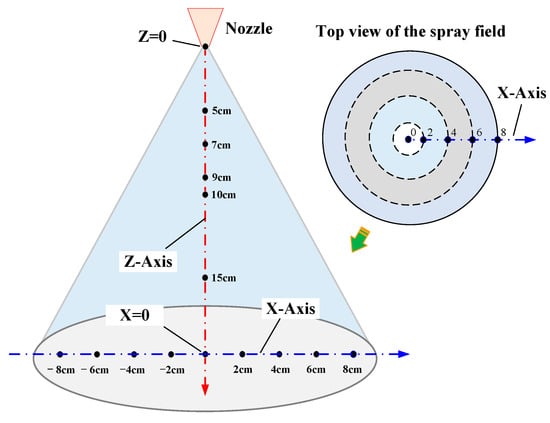 Diameter represents the droplet size; Time refers to the instantaneous moment when the system collects droplet data; Vx, Vy, and Vz are the velocity components in the X-, Y-, and Z-axis directions, respectively [16,33]. Over the course of the experiment, the PDPA sampling points were realigned to the origin based on the previously described configuration of the dust–mist flow field for measurement purposes. The parameters for each measurement point within the dust–mist flow field were tested in sequence, adhering to the specified step size.