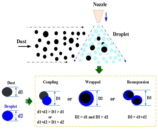 It is well known that the coupling between dust particles and mist particles will lead to an increase in the particle size of the coupling body [34], as shown in Figure 7. The coupling mechanism involving mist droplets and dust particles encompasses inertia collision, interception, diffusion effects, and electrostatic interactions among the high concentrations of mist particle droplets [35,36].