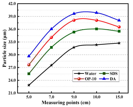 The results of the particle size distribution of mist droplets for different suppressant materials, as shown in Figure 8, include water, DA, OP-10, and SDS. For water, the particle size distribution initially remains lower than that of the other dust suppressants; this is attributed to the fact that water has a high surface tension and low viscosity as compared to the other dust suppressants, which makes water particles easy to break [37]. As a result, the mist droplet from water alone is less uniform and consists predominantly of larger droplets [38], limiting its effectiveness in applications requiring fine mist droplet dispersion during spraying.