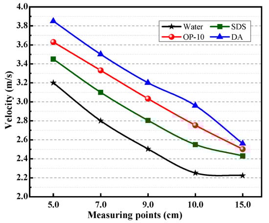 This experiment and the work of Huaizhen Yang [16] and Pascuzzi Simone [39] reveal that dust suppressants with a lower surface tension exhibit higher initial velocities compared to water. We observed a gradual decrease in velocity for the dust suppressants, aligning with their findings. These similarities indicate that surface tension significantly influences initial mist particle velocity, while the rate of velocity decrease is influenced by the specific properties of each suppressant [16]. Figure 9 shows the change in velocity of the different dust suppressants. It can be observed that the mist particle velocity decreases from 5.0 cm to 10.0 cm along the measuring points. At 5.0 cm, the mist particle velocity of DA, which has the smallest surface tension, reaches a velocity higher than that of water. Compared to DA, the mist particle velocity of OP-10 and SDS decreases more gradually.