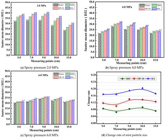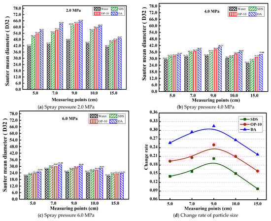 The relationship between the change rate and the measuring points for three dust suppressants DA, OP-10, and SDS is shown in Figure 10d. The water value was used as the reference baseline in this study. The change rate of the average size of the D32 across the different measuring points was calculated using the averaged data of water and each suppressant. As a whole, the change rate of the dust suppressant fluctuates up and down; the change rate of DA is the largest, with an average value of 18.2%, followed by OP-10, with an average value of 12.6%, and SDS, with an average value of 8.2%. The mean change rate of DA is 2.25 times greater than that of the SDS value and 1.38 times greater than that of the OP-10 value. According to the results in Figure 2a, the greater the reduction in surface tension DA > OP-10 > SDS, the larger the change rate. It is observed that when the surface tension of solutions is lower, the particle sizes of droplets tend to be larger. Consequently, the dust suppressant is less effective in promoting the atomization of smaller particles.