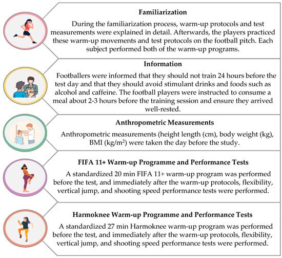 Flexibility tests, vertical jump, and ball speed measurements were performed under standardized environmental conditions (16–17 °C) at the same time. Tests were conducted between 5:00 pm and 6:30 pm. The participants were introduced to the warm-up and test protocols, and the study content was described in detail. Familiarization was applied for the FIFA 11+ and Harmoknee protocols. The same researchers monitored the measurements as part of a standard evaluation. A standardized 27 min Harmoknee warm-up program (five phases) and a 20 min FIFA 11+ warm-up program (three phases) were performed before the tests. The data for the study were collected at 48 h intervals. All participants completed all phases of both warm-up protocols in a counterbalanced and sequential manner.