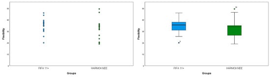 Flexibility scatterplots and box-plots of participants according to FIFA 11+ and Harmoknee warm-up protocols.