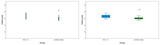 Vertical jump scatterplots and box-plots of participants according to FIFA 11+ and Harmoknee warm-up protocols.