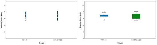 Shooting speed scatterplots and box-plots of participants according to FIFA 11+ and Harmoknee warm-up protocols.