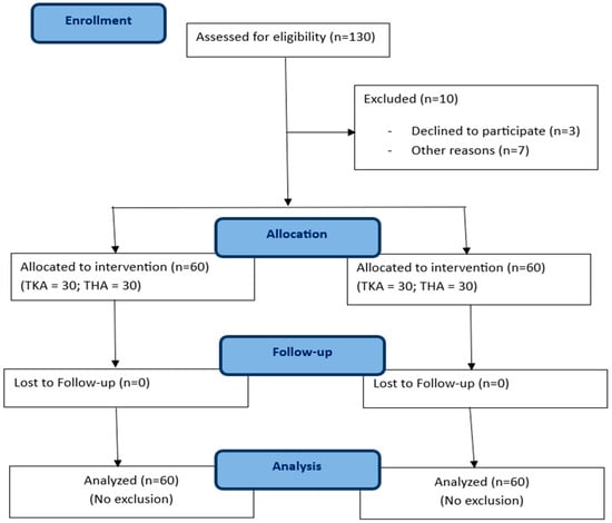 A prospective matched cohort study was performed involving collection of data on 130 consecutive patients who underwent primary THA and TKA for osteoarthritis (OA) between May 2023 and November 2023. The study protocol was approved by the local ethics committee, and the research was conducted in compliance with the Declaration of Helsinki. Informed consent was obtained from all individual participants included in the study. The inclusion criteria were (1) primary and elective THA and TKA for OA, (2) age older than 18 years at the time of surgery, (3) postoperative rehabilitation in CBR or HBR, and (4) participation in a minimum 1-month follow-up. The exclusion criteria were (1) revision THA and TKA, (2) THA and TKA performed for any diagnosis other than primary OA, (3) concomitant neurological and orthopedic diseases of the lower limbs, and (4) failure to understand or complete the questionnaires. Ten patients were excluded for different reasons; therefore, 120 of 130 patients, or 92.3%, were enrolled and evaluated (60 THA and 60 TKA) (Figure 1). Data gathered included the age and sex of the patients, as well as their side and body mass index (BMI).