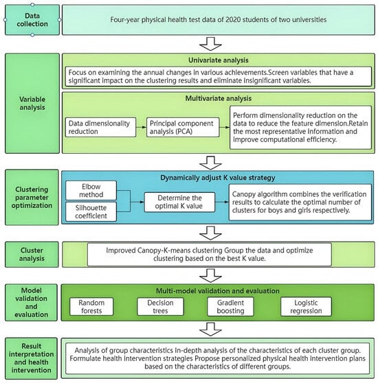 The improved K-means algorithm [21] combines the canopy algorithm [22,23] with traditional K-means clustering to enhance the clustering efficiency and accuracy of large-scale datasets. The K-means algorithm performs fine clustering within each canopy, reducing the complexity of global searches and improving clustering efficiency [24]. This method accelerates the computational process through initial grouping and fine-tuning, while also enhancing the accuracy of clustering results, particularly for large-scale datasets. This approach allowed for a more accurate grouping of students, which was essential for formulating personalized health management plans.