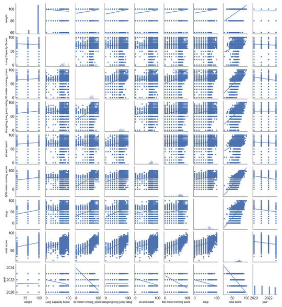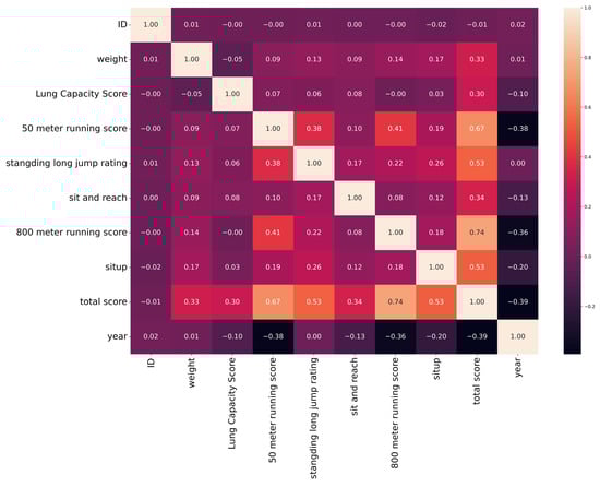 To investigate the interrelationships among physical fitness indicators, multivariate analysis [32] was employed. Figure 3 presents the Pearson correlation heatmap of selected physical fitness indicators. Pearson’s correlation coefficient was employed because it quantifies linear associations between continuous variables, which is suitable given that most physical fitness test scores approximate a normal distribution [33]. This type of multivariate analysis enables the simultaneous evaluation of interrelationships among multiple variables, allowing for the detection of interaction effects and multicollinearity that are not discernible through univariate methods alone. Such an approach provides a more comprehensive understanding of how different fitness components contribute to overall physical health and lays the foundation for predictive modeling and targeted intervention design.