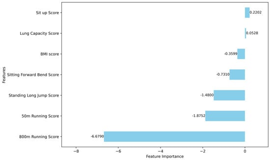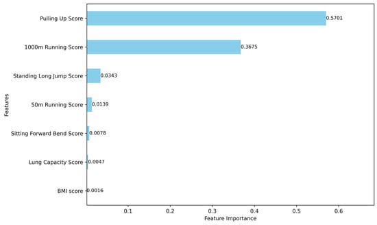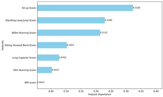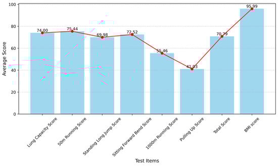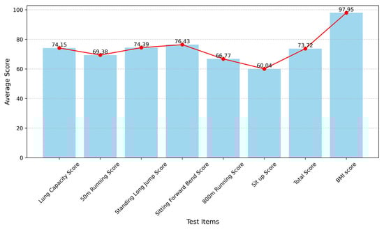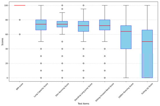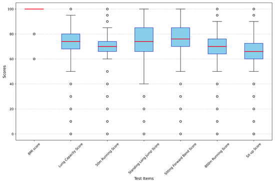 In response to the demands of the era, the Ministry of Education of the People’s Republic of China comprehensively revised and officially implemented the “National Student Physical Health Standards” in July 2014. This revision aims to construct a more scientific, comprehensive, and systematic student physical health monitoring and evaluation system, encouraging students to actively participate in physical exercise, guiding schools to deepen reforms in physical education and teaching, and promoting the vigorous development of school sports nationwide [2,3]. The new standards are specifically designed for university students and include a series of test items such as Body Mass Index (BMI), 50 m sprint, sit-and-reach test, vital capacity, standing long jump, pull-ups (for males)/1 min sit-ups (for females), 1000 m run (for males)/800 m run (for females), with detailed scoring criteria and evaluation methods to ensure the objectivity and validity of the test results. An overview of the test items and their corresponding weights is presented in Table 1.