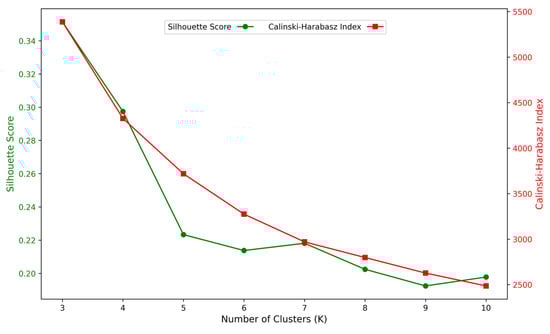K-means clustering is applied separately to the data of the male and female groups. The silhouette score [40] and Calinski–Harabasz index are calculated for each group, and the trends of these indicators are plotted as shown in Figure 9 and Figure 10. These plots are used to visualize the changes in the clustering quality as a function of K and assist in identifying the optimal number of clusters for both the male and female groups.