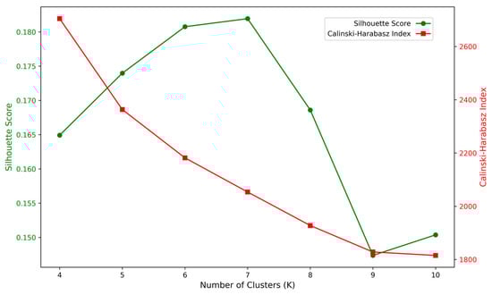 However, the elbow method can be somewhat subjective in practice, especially when the data distribution is complex or when the “elbow” is not distinct. Relying solely on the elbow method may lead to bias. Therefore, this study introduces the Calinski–Harabasz index [37] as a supplementary verification tool.
