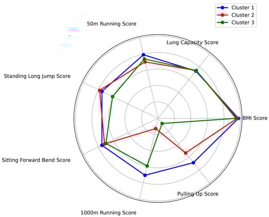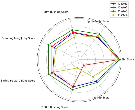 As shown in Table 3 and Table 4 and Figure 18 and Figure 19, male students were categorized into three clusters: a group with outstanding overall fitness, a group with weak upper and lower limb strength, and a group with weak aerobic endurance and upper limb strength. Female students were divided into four clusters: those with weak aerobic endurance, weak core strength, strong overall abilities, and weak lower limb explosive power. Each cluster reflects distinct physical fitness profiles, providing a basis for targeted intervention strategies.