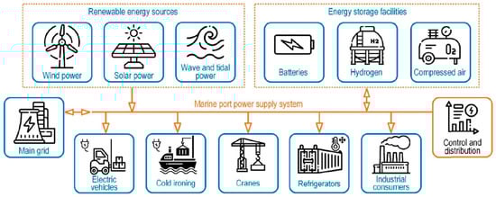 Figure 1 comprehensively represents the whole marine port power supply system, illustrating the interconnection between renewable energy sources, energy storage facilities, and various port-side energy consumers. On the generation side, the system integrates multiple renewable energy sources—including wind power, solar power, and wave and tidal energy—which are complemented by traditional grid electricity. These energy inputs feed into the port’s power infrastructure, which also incorporates diverse energy storage solutions such as batteries, hydrogen storage, and compressed air systems. The stored energy can be flexibly deployed based on demand fluctuations or generation variability. The system then distributes power to a wide array of port operations and consumers, including electric vehicles, shore-side electricity or cold ironing systems (onshore power for berthed ships), cranes, refrigerated storage units, and industrial facilities. A centralized control and distribution unit manages the flow and balance of energy across the system, ensuring efficient, stable, and sustainable operation.