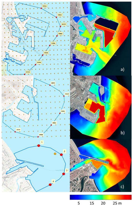 Valencia, Sagunto, and Gandía ports’ numerical domain and outer forcing locations along with numerical domain and bathymetry definition. The numbers in each image indicate the identification of the control points chosen in the model (a) Port of Valencia; (b) Port of Sagunto; (c) Port of Gandía.