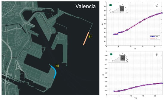 An example of wave-reflection coefficients (Kr) vs. individual/incident wave period (T) for two different breakwater typologies/sections at Valencia Port (a) Breakwater section of the north basin; (b) Breakwater section south of the harbour entrance channel.