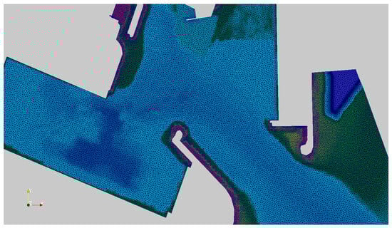 The numerical domain must adhere to the constraints of the MSP model, the spatial dimensions of the study area, and the waves that will propagate within it, as discussed in previous sections. The topographic file provided by the APV will be used to define the MSP port contour. On the other hand, to delimit the marine side of the execution domain, the MSP contour is completed with the line or polygon of wave generation, traditionally known as the “generation perimeter”, where the tool introduces the irregular waves, taking into account the directional range of waves in the study area so that the contour accommodates all of them. Furthermore, the criterion of numerical efficiency is met using an adaptive mesh in triangular and unstructured finite elements. The mesh allows the optimisation of the resources required by the MSP model (CPU memory), since the nodes and elements of the finite element mesh adapt to the geometric contours of the port and corresponding bathymetric depths. This concentrates a higher number of elements in shallower areas of the domain (smaller wave periods) and relaxes the mesh for deeper areas (see Figure 4). It is crucial to ensure that the generated mesh adequately evaluates the minimum wave period.