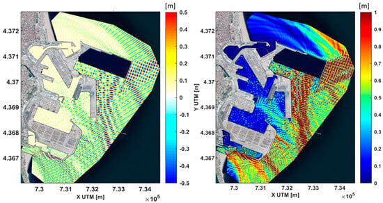 The MSP model is run on the Linux system, allowing simulations to be conducted at the IHCantabria Supercomputing and Information Technologies Laboratory. This significantly alleviates the computational burden of the project. Specifically, the NEPTUNO node within the ALTAMIRA node of the University of Cantabria is employed, part of the Spanish Supercomputing Network. This node features 1296 cores, 100 TB of storage, and 5 TB of RAM. Thanks to this supercomputing infrastructure, a monochromatic wave strategy can be expedited significantly, as it can be divided among different processors, thereby parallelizing the executions. For example, for a large port such as the Port of Valencia, with 528 monochromatic waves to be executed (with 3 repetitions based on tidal levels, reaching 1584 monochromatic waves), the overall execution time can be reduced to a maximum of 3 days. This capability provided by the IHCantabria infrastructure is advantageous for any repetition of catalogues (geometry changes, validation and calibration work, etc.) typically carried out in the pre-numerical assembly phase of each port (see Figure 5). Iterations (repetitions) are crucial during this phase to provide ultimate reliability to the operational agitation system. The results of each propagated case for each tidal level are stored in a general hypermatrix for each port, containing significant wave height (Hm0), peak wave period (Tp), and wave energy potential (Pw) at every location within the entire numerical domain, for all of the monochromatic runs and water levels. These catalogues of monochromatic waves will be used to reconstruct the spectra predicted by SAPO and obtain the spectral map of Hs across the entire domain. These pre-run agitation catalogues were provided to the client in Python 3.5 format for direct implementation into their operations and Environmental Management Dashboard (CMA). Additionally, analogous matrices are generated for the free surface and phase, which will be used for the directional wave decomposition of each variable related to waves and energy potential.